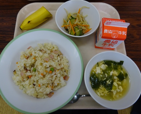 五目チャーハン、もやしのナムル、冬瓜の中華スープ、