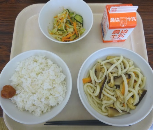 麦ごはん、梅干し、焼肉サラダ、わかめうどん、牛乳