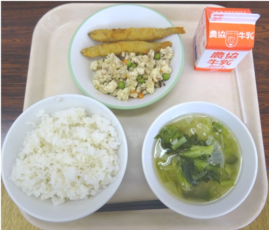 麦ごはん、ししゃもフライ、炒り豆腐、