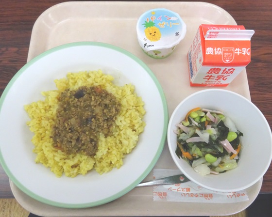 夏野菜のドライカレー、枝豆サラダ、パインゼリー、牛乳
