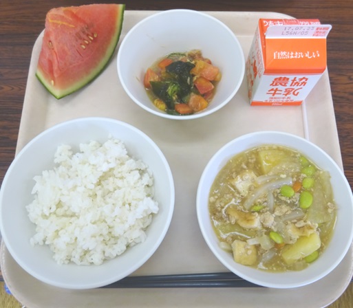 厚揚げとひき肉のうま煮、すいか、牛乳