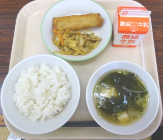 麦ごはん、春巻き、ホイコウロウ、中華スープ、牛乳