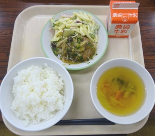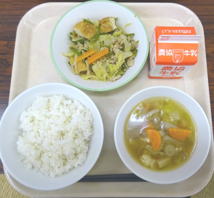麦ごはん、豚肉と野菜の炒めもの、けんちん汁、牛乳