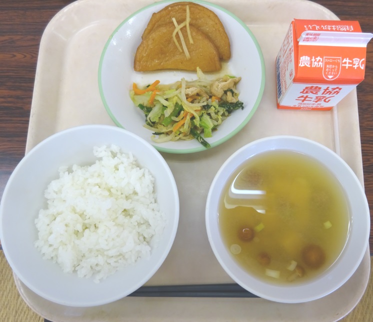 麦ごはん、豚肉と野菜の炒めもの、けんちん汁、牛乳
