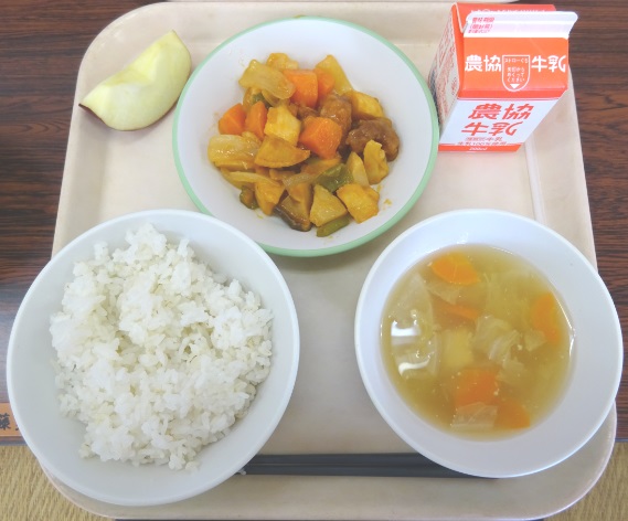 麦ごはん、酢豚、とろみスープ、りんご、牛乳