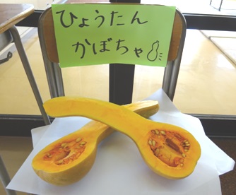 給食時間には、ひょうたんかぼちゃの紹介をしました。
