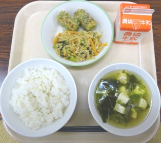 小松菜とコーンのごま和え、あごだしのすまし汁、牛乳