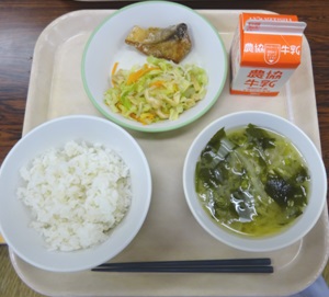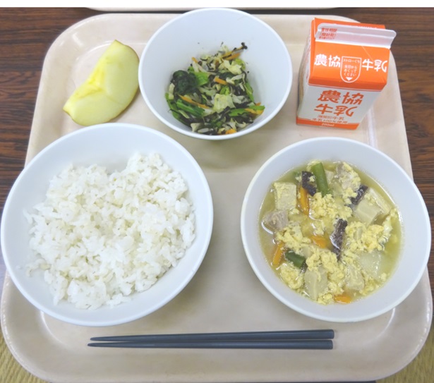 麦ごはん、ちくわの煮つけ、ほろほろ和え、豚汁、牛乳
