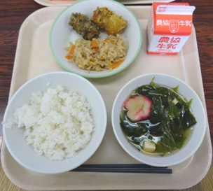 麦ごはん、ぶりのいしる風味揚げ、おひたし、けんちん汁、牛乳