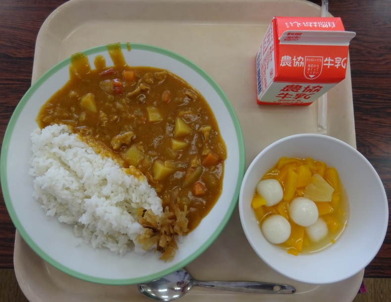 カレーライス、フルーツ白玉、福神漬け、牛乳