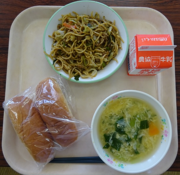 コッペパン、焼きそば、中華風コーンスープ、牛乳
