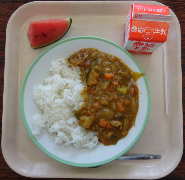 夏野菜カレー、福神漬け、すいか、牛乳