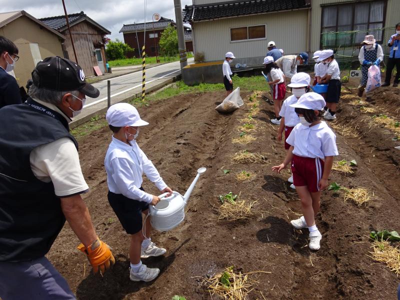 10日(金)の2限目に1年生がサツマイモの苗植えを行いました。直公民館さんの協力をいただいて、長生会の皆様に教えていただきながら、苗を植えていきました。(前もって畝づくりや除草もしていただきました。ありがとうございました。)7日に予定していたのですが、雨で延期になっていたので、子ども達はバケツの苗を見ながら今日を楽しみに待っていました。「お願いします」の挨拶の後、どうやって苗を植えるか説明を聞きました。いよいよ苗植えです。教えていただいた通りに、3畝にサツマイモ苗をやさしく丁寧に植えていきました。そして、じょうろで水を運んできて、苗にかけてあげました。さっそく来週から、水やり当番開始です。秋の収穫が楽しみですね。