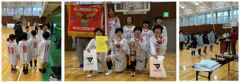 2月7日、健民体育館にて、珠洲市ミニバス春季交歓会・女子の部が行われました。直ミニバス教室は、予選リーグを2連勝で勝ち上がり、決勝で正院・蛸島ミニバス教室と対戦しました。前半は11対15と4点リードを奪われましたが、後半は気持ちとチームワークで追い上げ見事逆転し、28対26で勝利をおさめました。