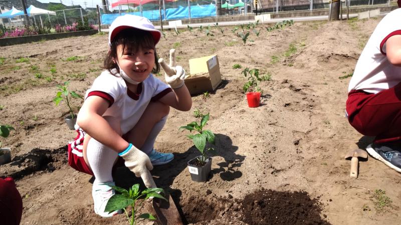 2年生が畑に野菜の苗を植えました。きゅうりやミニトマトの苗を、皆大切そうに畑に植えていました。つるが伸びた時のために、棒も立てました。これからお世話をしていきます。収穫が今から楽しみです。