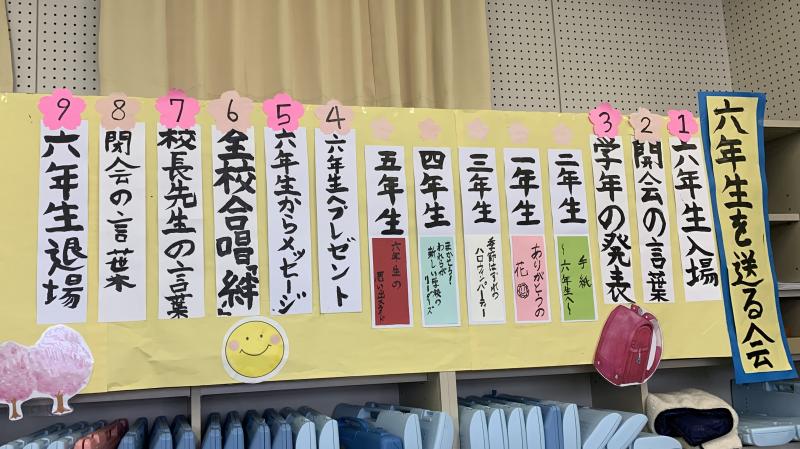 本日6年生を送る会がありました。どの学年の出し物も子供達の工夫が沢山あり、役者ぶりをいかんなく発揮、6年生への感謝に溢れていました。6年生は笑顔、笑顔、笑顔でした。避難所にもオンラインで中継しました。6年生にとっても、他の学年の児童にとっても、素敵な素敵な思い出の1ページになったはずです。