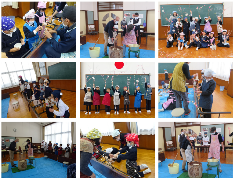 きねとうすを準備していただき、白と赤のもちをみんなでつきました。ついたもちは、小さく丸めて丸めたもちを、枝につけました。もちつきの楽しさ、もちを丸める難しさなどいろいろな体験ができました。できた花もちは、一人一枝ずつおみやげにいただきました。