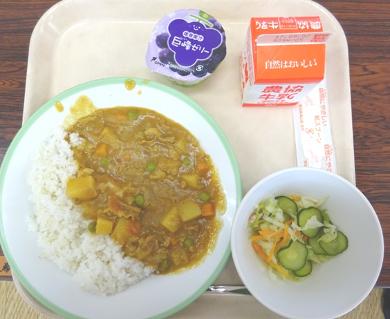 カレーライス、ドレッシングサラダ、巨峰ゼリー、牛乳