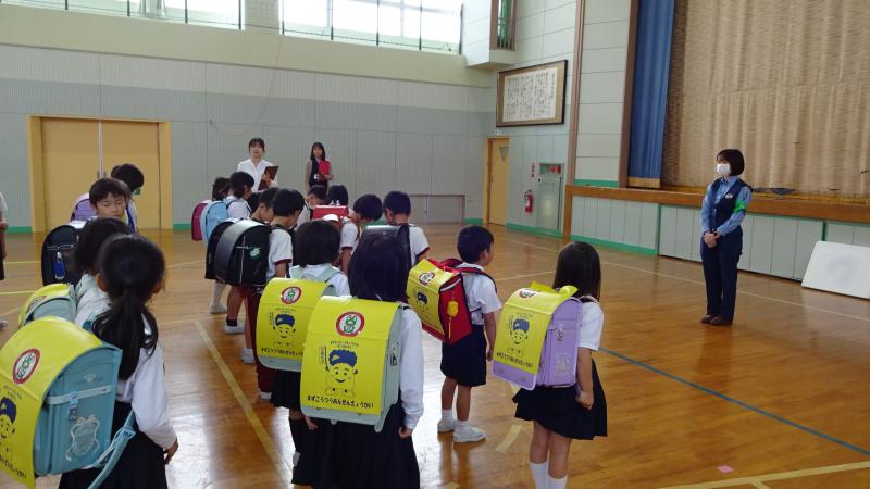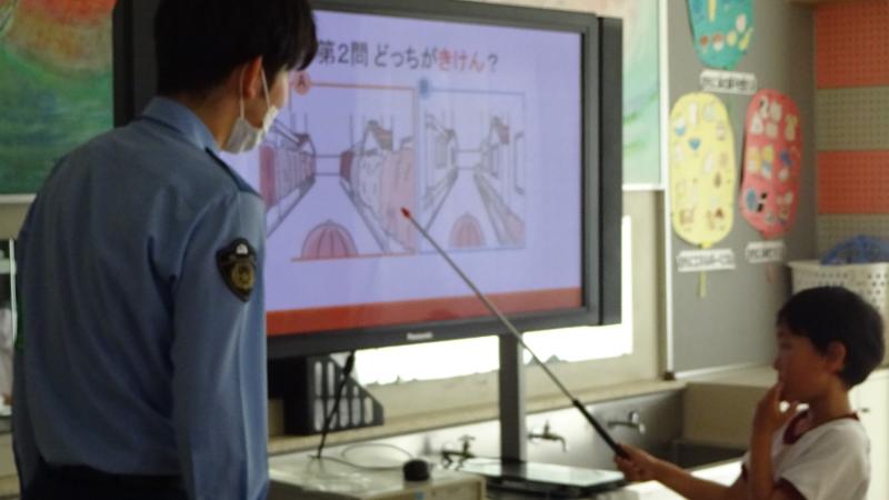 珠洲警察署からご担当の方においでいただき、防犯教室を行いました。不審者にランドセルをつかまれた時の対処法、どういうところが危ない箇所か等、自分の安全を守るために大切なことを沢山教えていただきました。教えていただいたことを踏まえ、これから安全な日々を過ごしてほしいと思います。