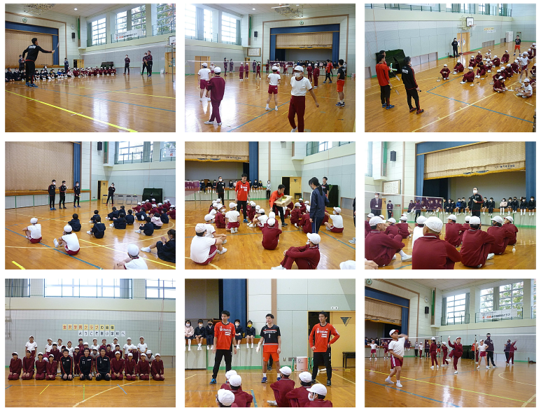 98日の午後、本校でスポーツ教室が行われました。県の「トップチームとの包括連携協定事業」に応募し、金沢学院クラブ(バドミントン)の皆さんが来校されました。本校では、一昨年度ツエーゲン金沢(サッカー)、昨年度ヴィンセドール白山(フットサル)が来校され、今年で3年連続となりました。金沢学院クラブからは西念副部長さんと、藤田・荒井・坂井選手の3名が来て下さいました。