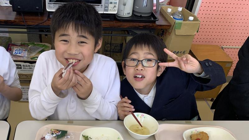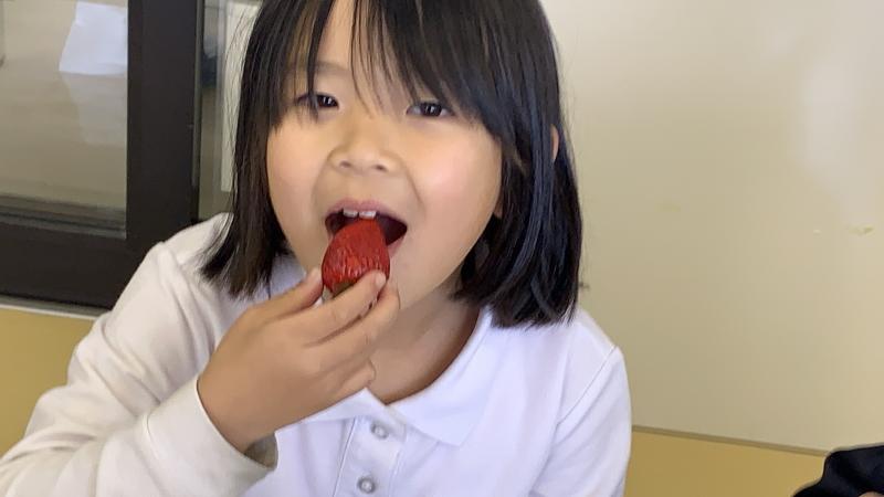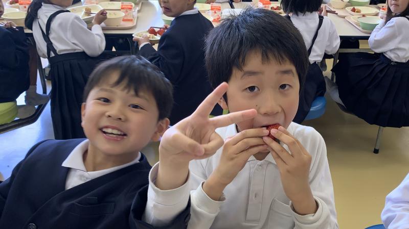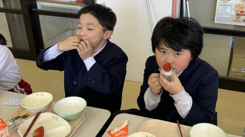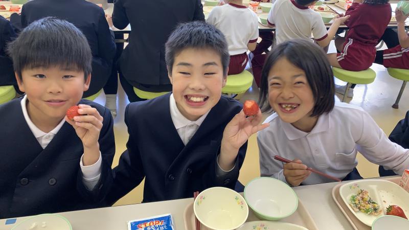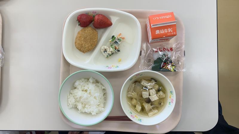いつも美味しい給食に、本日は、「いちご」と「かしわもち」がつきました。いちごは、ご支援でいただいたものです。とても瑞々しく甘かったです。「かしわもち」と合わせて、いちご大福のように食べている子もいました。今日も笑顔いっぱいの給食となりました。