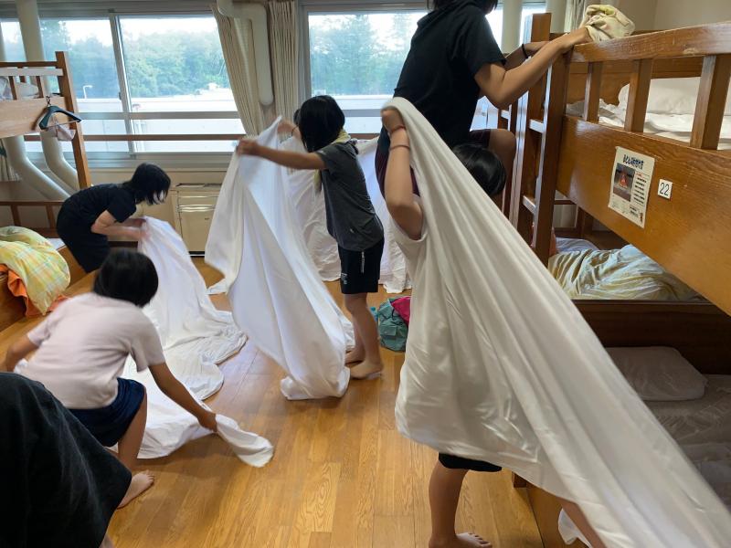 朝6時起床。シーツを畳みます。