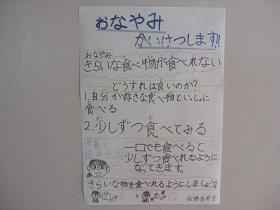 保健委員会が、みんなのなやみを和らげられればと、保健室前に「おなやみそうだんポスト」を設置しています。迷っていることから辛いことまで、おなやみがある場合は、保健委員、教職員やスクールカウンセラーが対応しますので、安心して相談してください。食べ物の好き嫌いのことなど、みんなにあてはまるものは、紹介したいと思います。(名前は出しません)