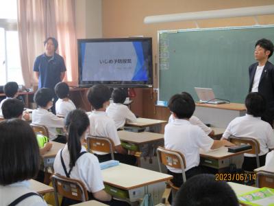 6年生が、弁護士の井奈尚史さんをお迎えして、いじめ予防教室を行いました。何がいじめにあたるのか、いじめられるとどうなるのか、加害者も将来に渡って大きなリスクを伴うことなど、具体的な事例を交えてお話ししてだきました。相手の心の状態や人の立場になって物事を考え、自分がされて嫌なことはしないということが大切であり、傍観者ではなく、いじめを見かけたらすぐに周りの大人に相談することの大切さを確認しました。