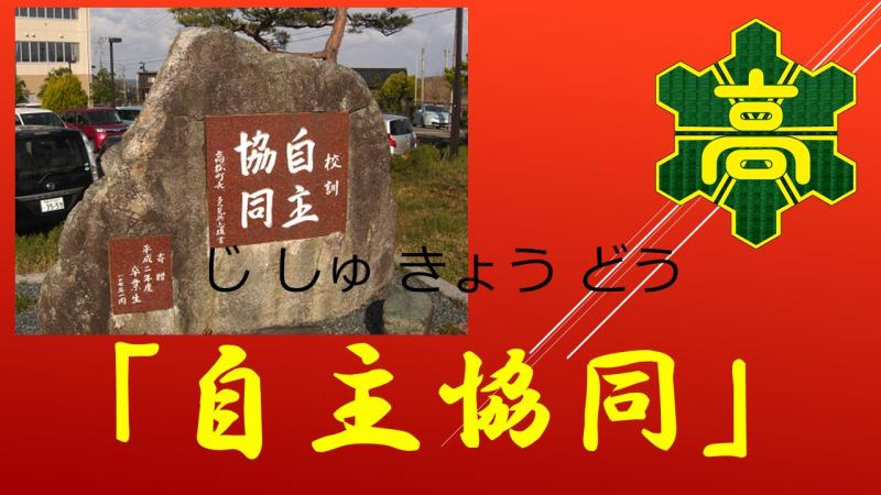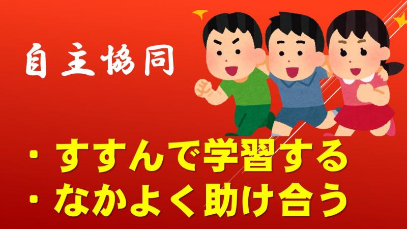 今日から9月です。全校集会で、校訓のお話をしました。本校の校訓は「自主協同」です。この校訓が制定されたのは、昭和35年だそうです。また、前庭にある校訓の石碑が建立されたのは、平成3年です。「自主」の部分は『進んで学習する』を意味し、「協同」の部分は『なかよく助け合う』を意味しています。子どもたちには、コロナ禍や熱中症が心配される中で、自分でよく考え、人のためによく考えて行動しよう、という話をしました。