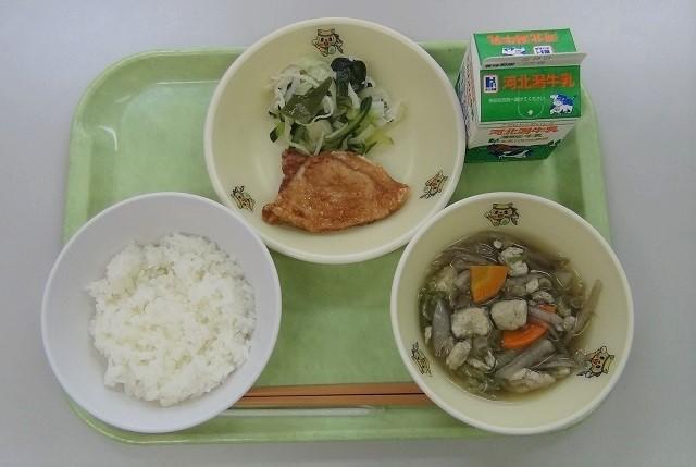 ごはん ぶたにくのおいだれ すのもの けんちんじる 牛乳