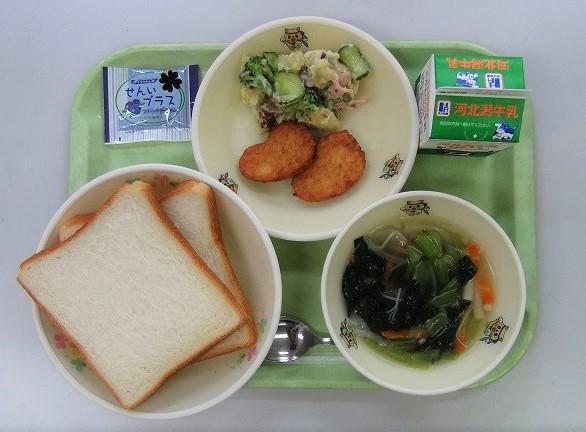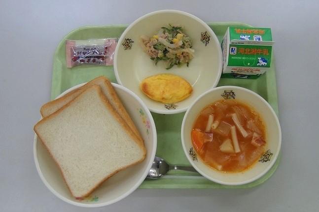 ミルクしょくパン メイプルジャム オムレツ だいこんとツナのサラダ ミネストローネ 牛乳