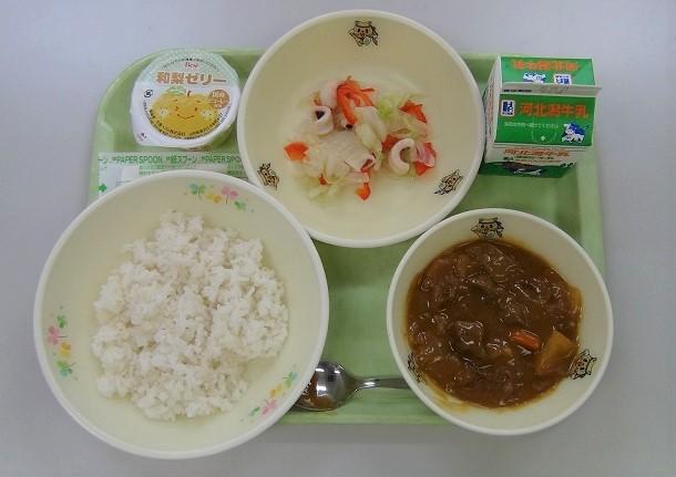 むぎごはん のといかのマリネサラダ のとうしのカレー わなしのゼリー 牛乳