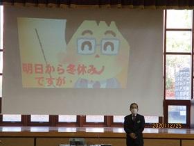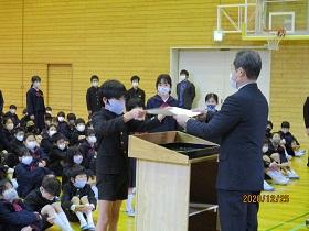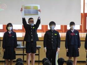 2月の全校集会を放送で行いました。はじめに、校内書き初め大会の入賞賞者の表彰を行いました。学校長からは、①コロナ感染拡大防止のためのマスク、手洗い・消毒、ソーシャルディスタンスについて ②節分について ③いじめ防止について話をしました。生徒指導からは、今月の生活目標である「感謝の気持ちを伝えよう」についての取組について伝えました。