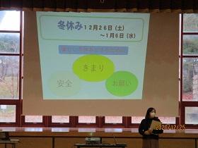 また、改めてあいさつの大切さについて伝えました。「おはよう」「さようなら」に加え「ありがとう」「すみません」「ごめんなさい」など相手を思いやる言葉がたくさん飛び交う教室にしてほしいと呼びかけました。
