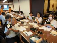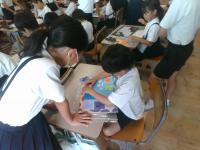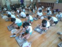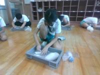 歴史体験教室を行いました。最初に、市役所の方にサポートしていただき、1学期に作った土器を焼き上げました。焼き上がったものは後日持ち帰ります。そして、石川県埋蔵文化センターの方に、縄文時代の石器、土器の実物を見せていただいたり、黒曜石で紙を切ったり、勾玉づくりを行ったりしました。