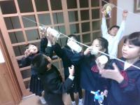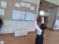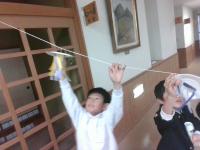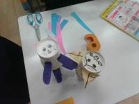 1年生の図工で,「スルスル ビューン」というすべる仕組みを使った工作をしました。何がすべったら楽しいかを考え,鳥や猫などの動物や,オムライスやプリンなどの食べ物を作ってクリップをつけ,2階から下げたひもの上をすべらせて遊びました。作ったものがすべって落ちていく様子を楽しむ姿が見られました。