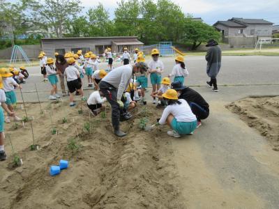 昨日(5月10日)は1年生がサツマイモの植え方を、今日(5月11日)は2年生が夏野菜(キュウリ、ピーマン、ナスビ、ミニトマト)の植え方を教わりました。「大きくなあれ」といいながら水やりをしていた子どもたち。中には「ナスビはきらいだけど、自分の育てたナスビはきっとおいしい」と早くも収穫を楽しみにしている子もいました。これからも、しっかりお世話してくださいね。