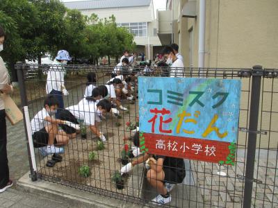 今日の昼休みに、地域の方々にお手伝いして頂き、コミスク花壇に花の苗を植えました。環境委員会の子どもたちの他にボランティアを募ったところ、30人以上の子どもたちが手伝いに来てくれました。子どもたちと地域の方々とで植えた色とりどりの花が、夏から秋にかけて学校の玄関をきれいに飾ってくれるでしょう。