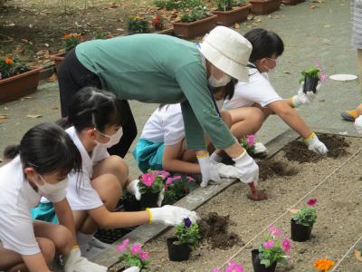 先日掘り起こした花壇に、夏から秋の花の苗を植えました。サルビアやマリーゴールド、日々草などです。地域のフラワーアドバイザーの皆さんに教えていただきながら、子どもたちも参加して植えました。これからどんどん大きくなって花壇いっぱいに花が広がりと思いますので、ご来校の際にはぜひご覧ください。