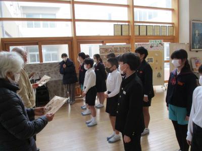 環境委員会の子どもたちが、コミスク花壇のお世話をして下さっている、5名のフラワーアドバイザーさんをお招きして、感謝の気持ちを伝えました。感謝の言葉と共に、落ち葉や木の実などで子どもたちが作った、クリスマス飾りをプレゼントしました。アドバイザーの皆さんに喜んで頂き、子どもたちも笑顔でした。