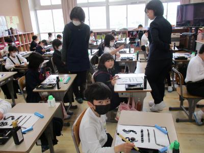 今年も地域で書道教室をされている竹中絹子先生をゲストティーチャーとしてお招きし、3年生の児童に、道具の扱い方や基本の筆づかいを教えていただきました。3年生にとって、初めての書写の授業でしたが、竹中先生に教えて頂いたことを思い出しながら、集中して取り組むことができました。今後、他の学年でも実施を予定しています。