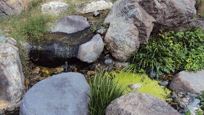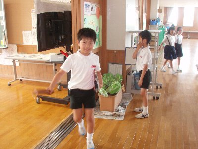 お祭りには金魚すくいの店が出ていました。そのせいでしょうか、夏祭りの時もそうでしたが、祭りが終わると学校の池に珍客がやってきます。それはかわいらしいちいさな金魚。すくった金魚を学校の池に放流?してくださる地域の方がおいでるようです。昨年も数匹・・・鯉といっしょだと住み心地が悪そうなので、上段の金魚池に移しています。昨年は「サギ」に食べられてしまったので、今年は自然の草で隠してあります.。これで4匹になりました。元気に育ったら教室で飼おうかな。