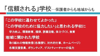 なお、当日使いました各種学校評価の結果のダイジェスト版をちょうど今週保護者の皆様に配付いたしましたのであわせてご覧いただければと思います。