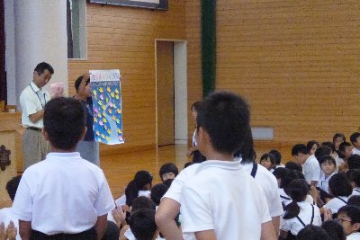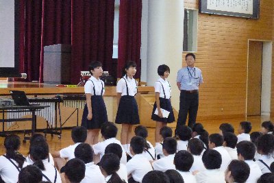 学校集会にあわせ、清水育英会から城村様、三宅様のお二人が来校され、本校児童3名を表彰して下さいました。「清水賞」は50年の歴史を誇り,善行賞、他の範たる子どもが最高学年のクラスから1名ずつ表彰されます。