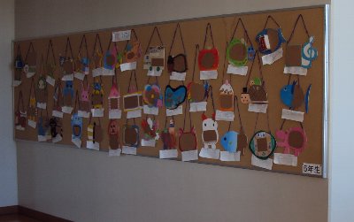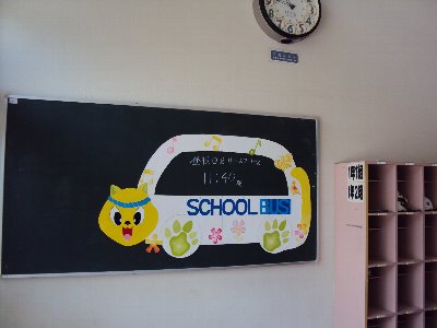 玄関を入った所に新しい掲示板ができました。図工の丸尾先生の力作です。「トトロ」に出て来る「ねこバス」をもじってあるのですが、写真をよく見て下さい、みんなから愛されているかほく市のゆるキャラ「にゃんたろう」がスクールバスの時刻表になりました。