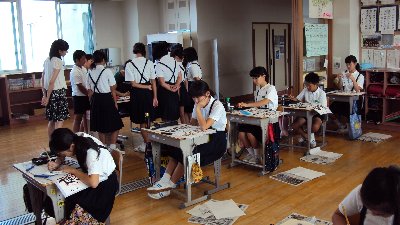 昨日の竹中先生に続き、今日は午前中城村先生が書き方の学習支援をして下さいました。1限目は、1年2組で硬筆、みんな先生を取り囲んで上手な字の書き方を習っていました。