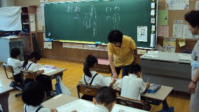 今日から古宮町の竹中さんに学習支援をしていただいています。今日の1限目は6年2組の毛筆指導をお手伝いしてもらいました。実際に書きながら上手に書けるポイントを竹中さんが説明して下さっています。子どもたちがまわりを囲んで習っています。おかげで習字の腕がめきめき上がっています。次の授業参観では習字の掲示をじっくりご覧下さい。ボランティアにはもうひとかた城村さんもおいでます。ほんとうに熱心なご指導感謝しています。