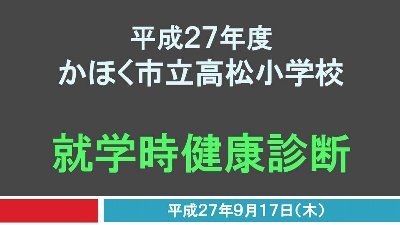 17日午後より市内トップを切って平成28年度入学予定者の健康診断を実施しました。来年度の入学予定者は71名、全員元気に参加しました。緊張している子、いつも通りにのびのびしている子、いろいろでしたがみんな来春の入学を楽しみにしている様子がうかがえました。健診中、保護者には、別室で「入学までに」というテーマで話を聞いてもらいました。