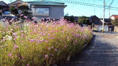 学校の外も秋です。畑一面に咲いた「コスモス」、場所は学校下の流川町地内です。コスモスの向こうには、小さくて分かるでしょうか、見守り隊の方が写っています。流川老人クラブの皆様ありがとうございます。