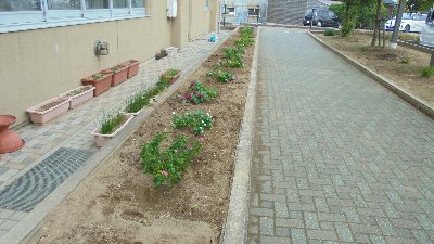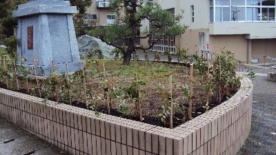 学校前の横断歩道を渡り、左右に分かれて学校へ毎日登校しています。その正面に小さな庭があり銅像が建てられています。長い間にその庭の植栽(つつじやさつき)が枯れてしまい、草ぼうぼうになっていました。先日学校の顔がこのままではいけないということで、新しく植木しました。来年の春にはすばらしい姿になると思います。ご支援いただいたPTAの方々ありがとうございました。
